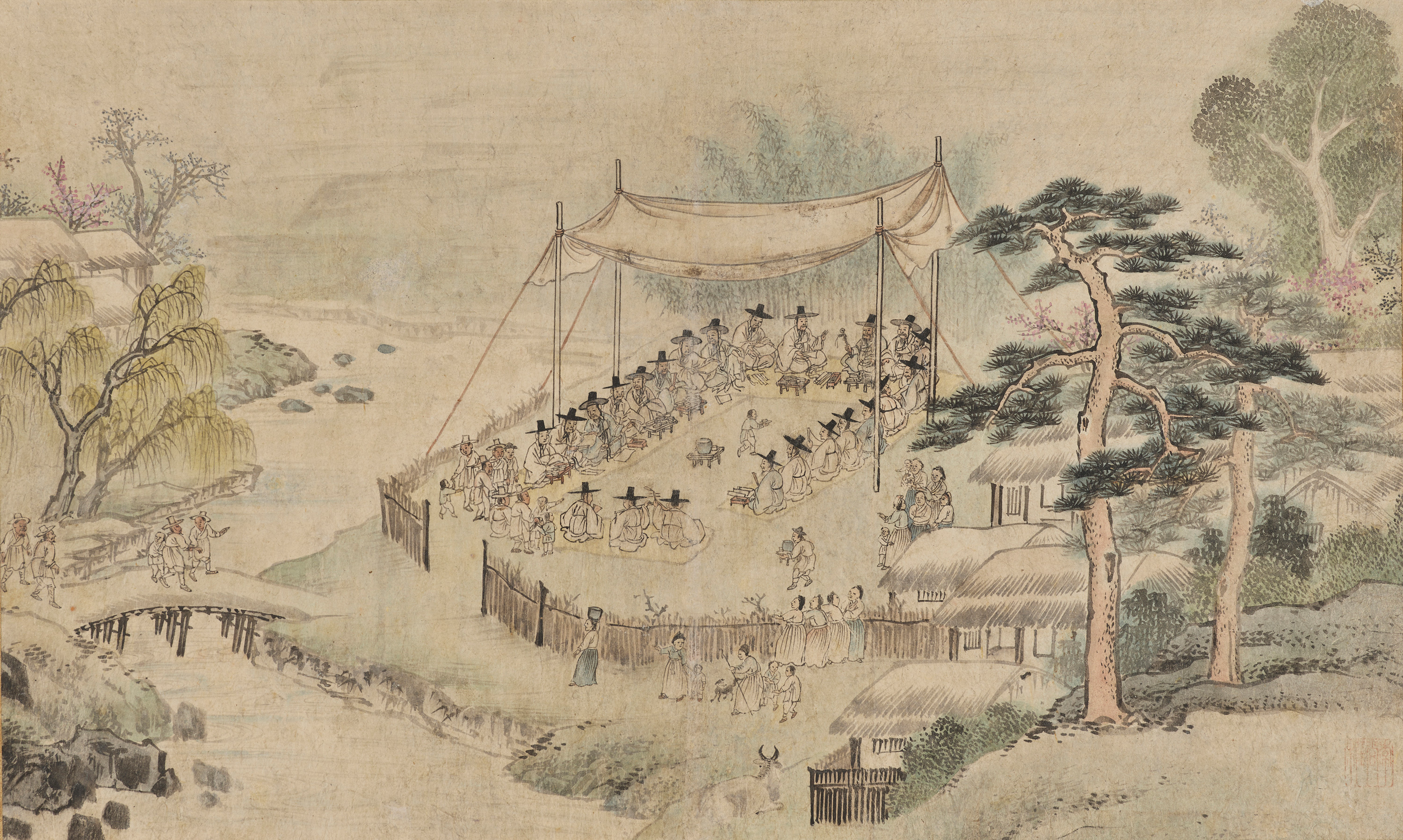 のどかな田園での文人たちのパーティーです。村の老若男女が興味津々で見物しています。