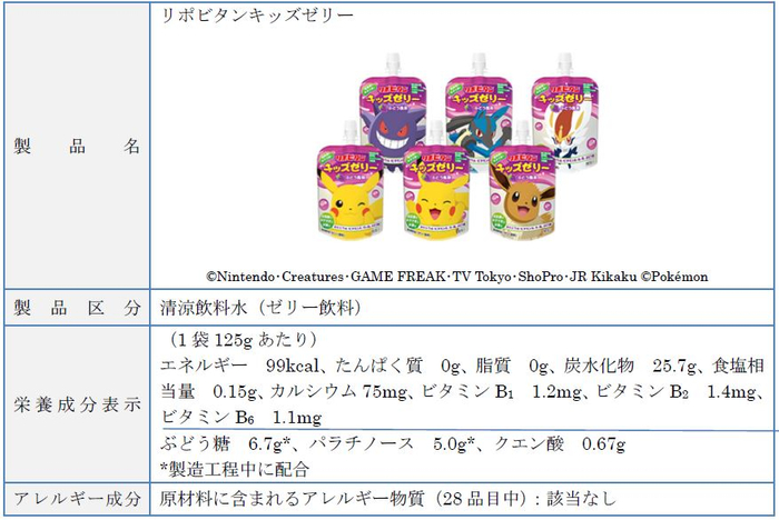 大正製薬株式会社[本社:東京都豊島区 社長:上原 茂](以下、当社)は、子ども達に大人気のTVアニメ「ポケットモンスター」(以下、ポケモン)をラベルや外装にデザインした当社製品「リポビタンDキッズ」(指定医薬部外品)、「リポビタンキッズゼリー」(清涼飲料水)を購入してご応募いただくと、アニメで活躍中のポケモンが描かれたオリジナルグッズが抽選で当たる「リポビタンキッズシリーズを買って、ポケモングッズを当てよう!」キャンペーンを7月1日(木)~8月31日(火)で実施いたします。