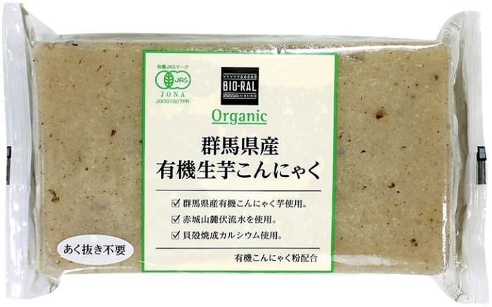 群馬県の赤城自然栽培組合の有機こんにゃく芋と、赤城山系伏流水を使用して作られたこだわりのしらたきとこんにゃく。ホタテ貝の貝殻から作った天然由来の凝固剤、焼成カルシウムを使用しています。
