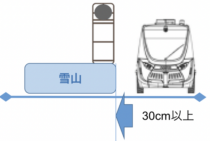 除雪作業により路肩に寄せた雪が走行ルート上にはみ出していると、自動運転バスが障害物として検知してブレーキがかかります。東川町の都市建設課とBOLDLYは、連携して除雪作業を実施するとともに、除雪した雪を十分に路肩に寄せてルートの整備を行います。また安全性を担保できる範囲内で、走行ルート自体をやや中央線寄りに設定する工夫も行います。バス停付近では、自動運転バスが路肩に寄って停車するため、さらに除雪が必要です。下の図の通り、バスの停車位置から横30cm以上、前方1m以上、後方2m以上の除雪を実施し、安全にバス停で停車できる環境を整えます。