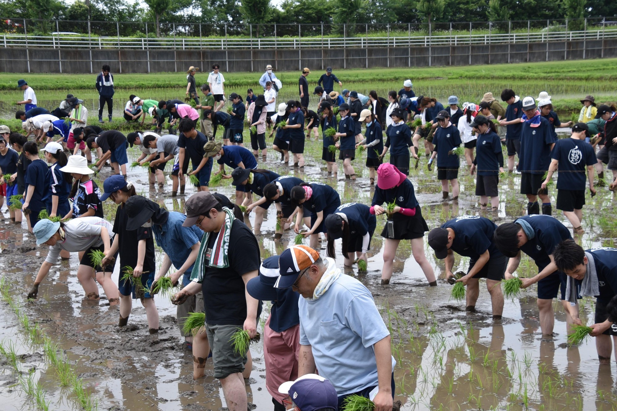 春日井(鷹来)キャンパス農学部付属農場で6月21日、恒例の田植祭が開催され、農学部の教職員や大学院生、学生、附属高校の生徒ら約200人が参加し、真夏を思わせる梅雨の晴れ間が時折のぞく中、熱中症に注意しながら手植えによる田植え作業に汗を流しました。