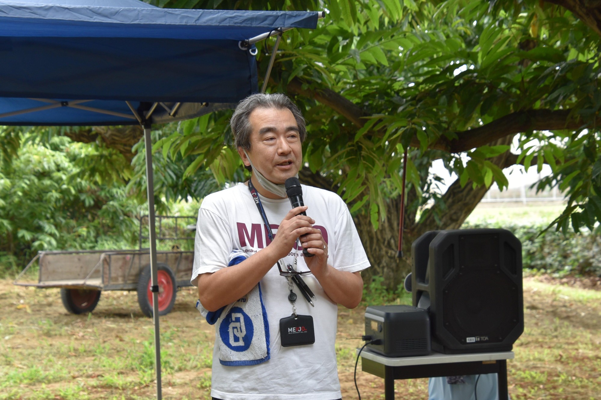 作業の前に、氏田稔農学部長、小原章裕専務理事、附属農場長の林利哉教授が「今、備蓄米のニュースが盛んに報じられているが、農学部で学ぶ私たちは米はどう保存し、どうスーパーに並び、どう値段がつけられるのかを考えたり、調べたりするきっかけにしてほしい」などとあいさつ。熱中症への注意も呼びかけられました。