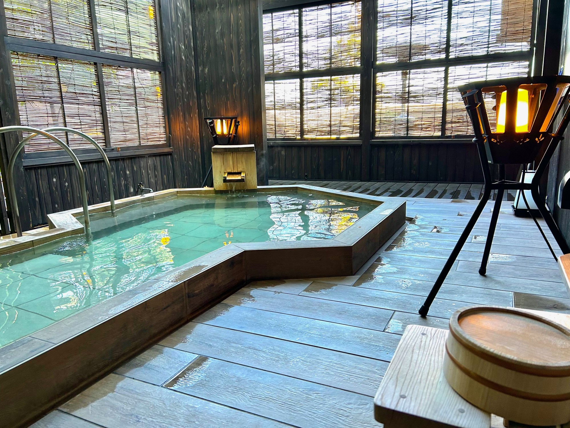 お腹が満たされたら、内湯や専用露天風呂へ直行。昭和46年開湯のラジウム泉の名湯「岩屋温泉」。弱アルカリ性のやわらかな湯を24時間貸し切りで楽しめます。
