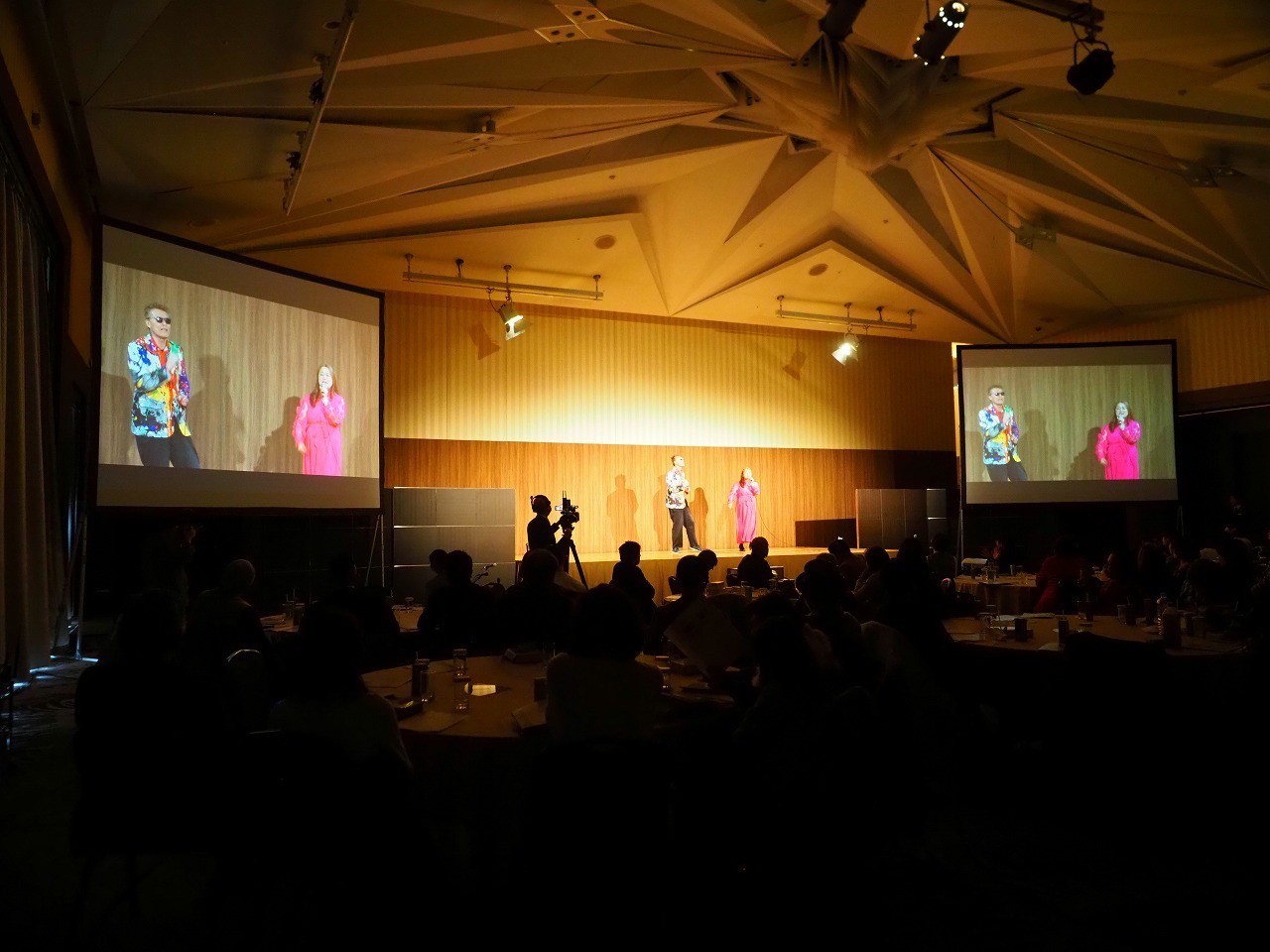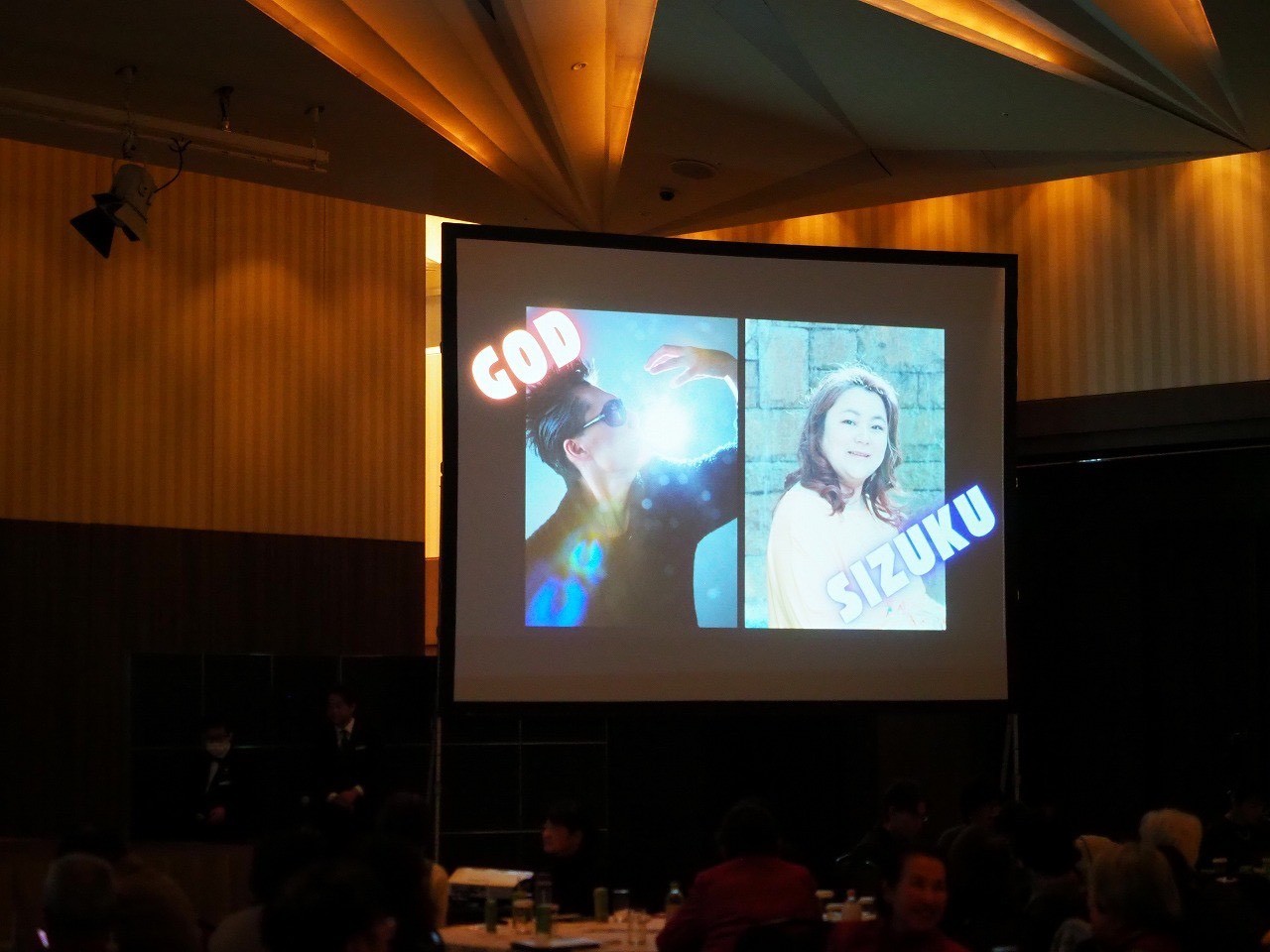 夜の懇親会では、GODは絵の具をこぼしたようなグラデーションのジャケット、SIZUKUはブルーの衣装で登場しました。