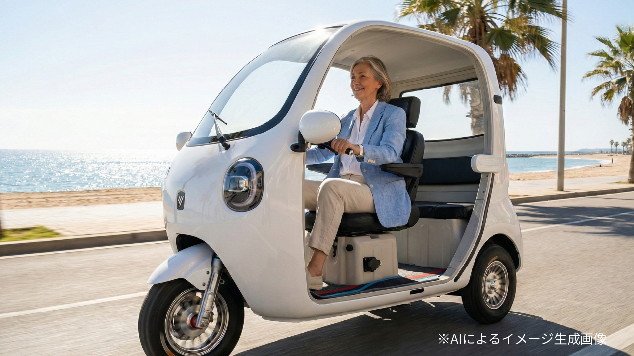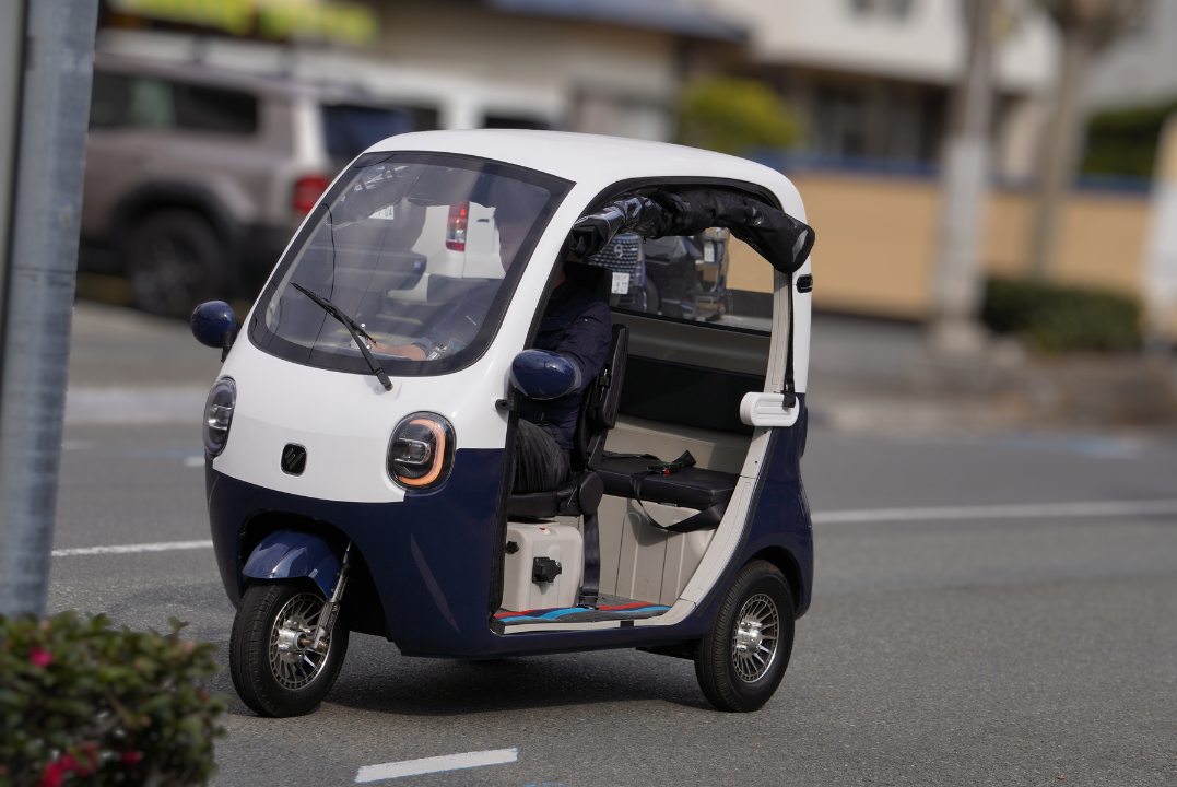 屋根付き三輪設計により安定性を確保。特別な二輪免許を必要とせず、普通自動車免許で運転可能です。