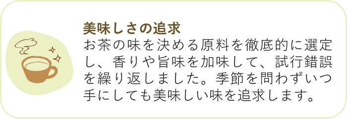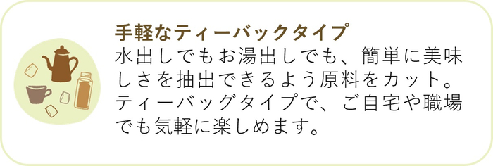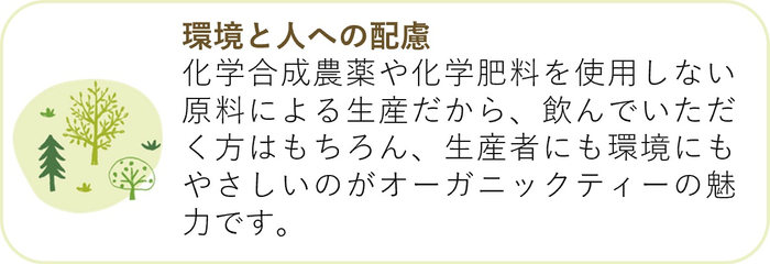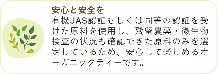 味覚も気持ちも満足するような美味しいお茶を、安心して気軽に、毎日楽しんでいただきたい。その想いから、「オーガニックティー」シリーズは誕生しました。こだわりをベースにした豊かな味わいのお茶が、ほっとする気分と笑顔溢れるやすらぎのティータイムをお届けします。オーガニックに親しんでいる方はもちろん、初心者の方にも、日常の一部として気軽にお楽しみいただけます。