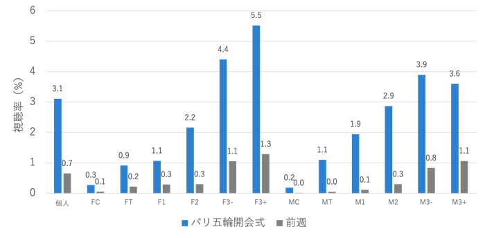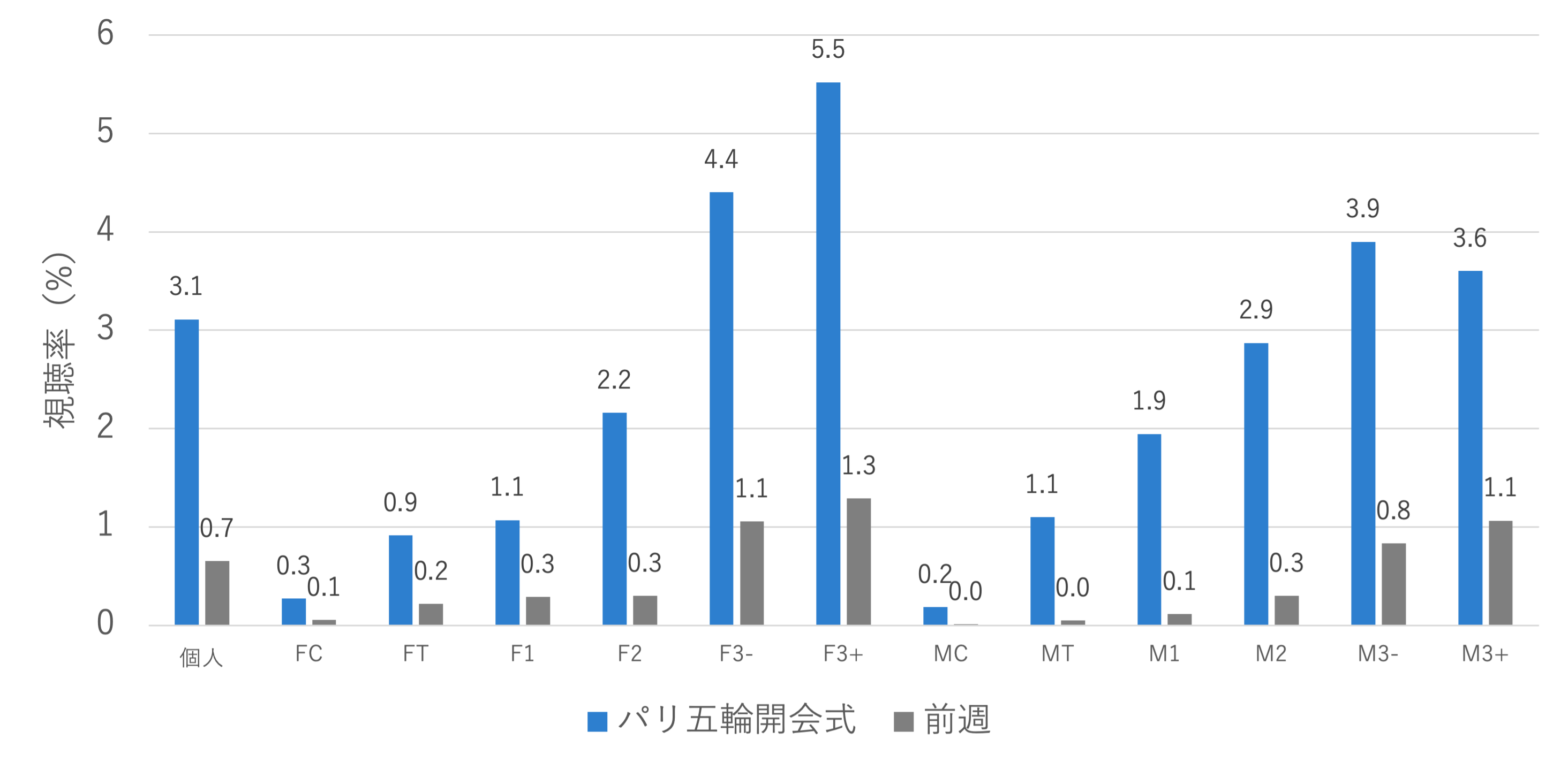 全ての性年代で前週の視聴率を大きく上回り、中でもF3+の視聴率が最も高く5.5%となりました。また、若年層(FT, F1, F2, MT, M1, M2)は前週時点では0.5%未満という非常に低い視聴率だったにも関わらず、今回1〜3%程度の視聴率となっており、オリンピックが幅広い年齢層に訴求できるコンテンツであることが伺えます。