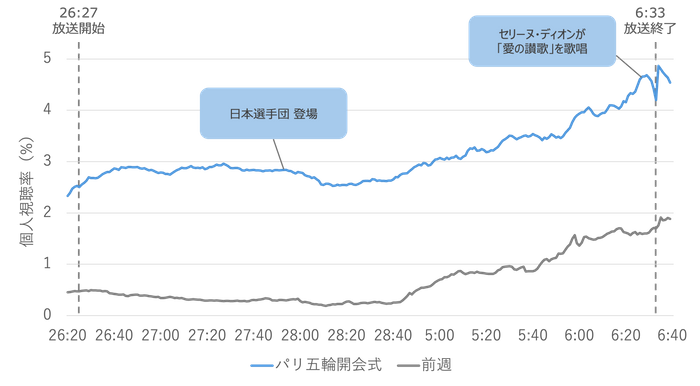 日本選手団が登場したのは28:00頃でしたが、登場時間が比較的短かったこともあり、大きな視聴率の変化はありませんでした。最も視聴率が高くなったのは、セリーヌ・ディオンが「愛の讃歌」を歌唱している6:25頃で、4.7%でした。