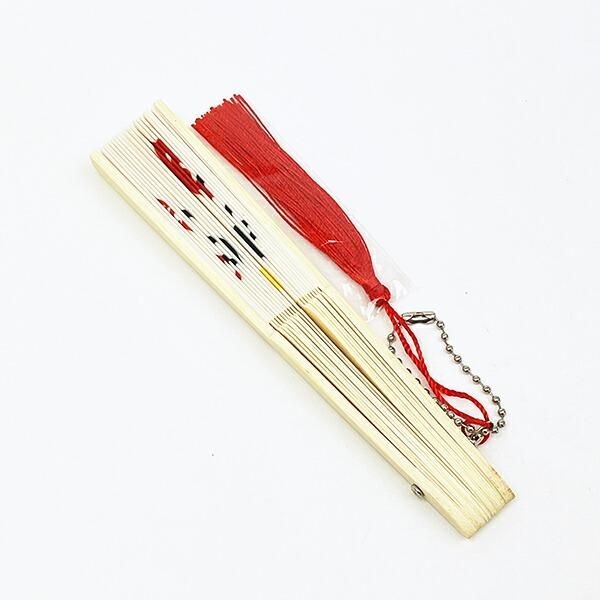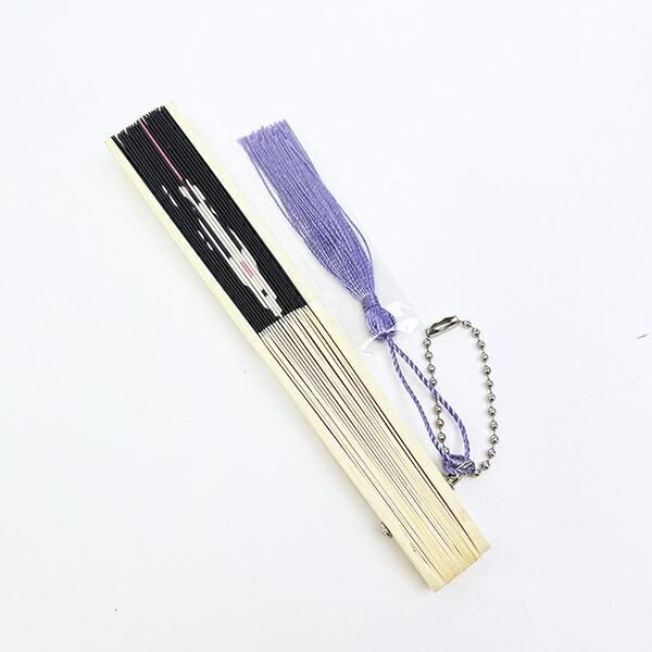 ボールチェーン付きでカバンにつけ、必要な時に扇子としてお使いいただけます。持ち運びようということでミニサイズ感がまたもやかわいらしい印象です。イベント、花火大会など、ちょっとほってりする日にお勧めです。サイズ:15cm×2cm×1cm 素材:ポリエステル・竹