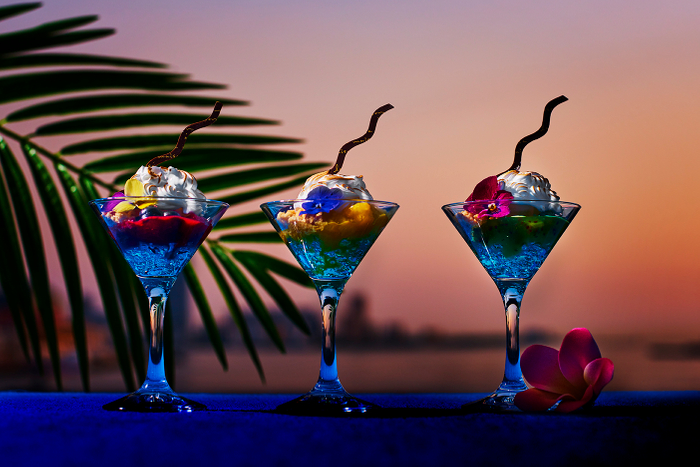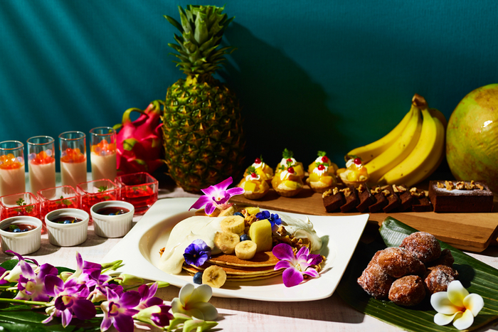 もちろんデザートもハワイ一色!おすすめは見た目も涼しげなライブデザート「Momona Pole(モモナ・ポルー)」。ハワイ語で、モモナは甘い、ポルーは青。キラキラ輝くビーチのようなブルーハワイ風味のクラッシュゼリーにバニラアイスを乗せ、最後に3種類から好きなものをチョイス出来るフルーツソースをたっぷり。見た目も味もリゾート気分をお楽しみいただけるイチ押しスイーツです。他にも、人気菓子”マラサダ”や、トロピカルフルーツクリームのハワイアンパンケーキ、ココナッツやマンゴー、アサイーを使用したデザートなどが並びます。