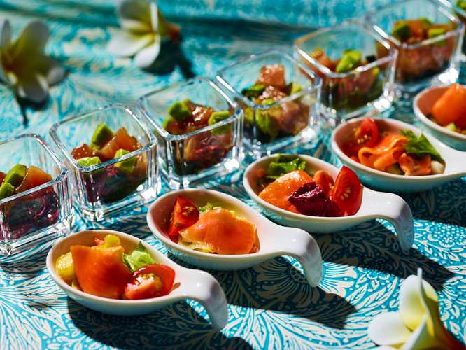 【前菜・サラダ】ロミロミサーモン、アヒポケ、コールドジンジャーチキン、紫サツマイモの大豆チーズ和え、ピピカウラ風 甘醤油和え、マックサラダ、シーフードマリネ、ハワイアンカラフル寿司、他