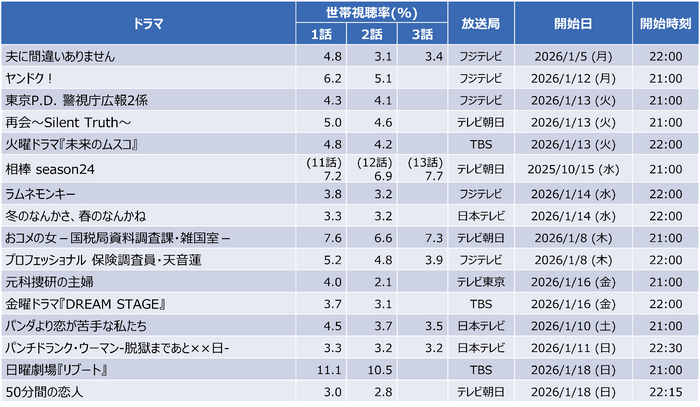 まずは、2026年冬ドラマの初回から第3話までの世帯視聴率を放送回ごとに見ていきましょう。16作品の各話視聴率を以下の表にまとめました。
