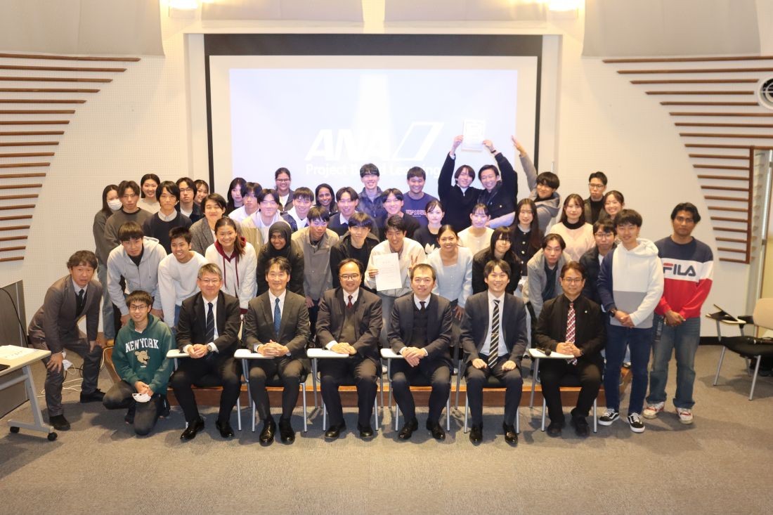 岡山理科大学がANAグループ整備部門(以下、「e.TEAM ANA」※)の人材育成を担う全日本空輸株式会社整備センターの協力を得て、今年度スタートした共同人材育成プログラム。12月17日には岡山キャンパスの学園創立50周年記念館で、航空業界の課題解決に向けて9チームの学生たちが、自分たちで考えたビジネスプランをプレゼンしました。うち2チームの提案が「創造性と実践性が高く評価」され、全日本空輸の企業賞を受賞しました。