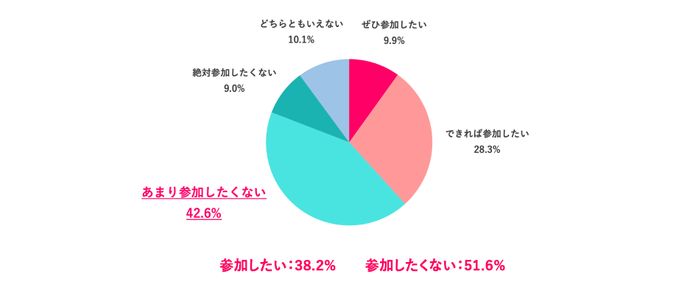 「ぜひ参加したい」(9.9%)、「できれば参加したい」(28.3%)を合わせた「参加したい」派は38.2%であったのに対し、「あまり参加したくない」(42.6%)、「絶対参加したくない」(9.0%)を合わせた「参加したくない」派は51.6%となり、「参加したくない」派が上回りました。