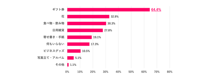 次いで「花」「食べ物・飲み物」「日用雑貨」と続きました。記念品のような形に残るものよりも、消耗品や普段使いができるものの人気が高いようです。また、「何もいらない」という人も17.3%いました。