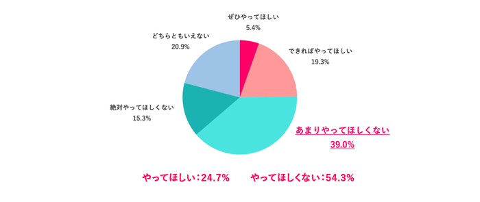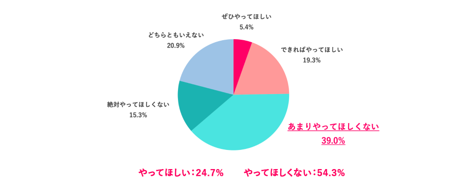 「ぜひやってほしい」と「できればやってほしい」を合わせた「やってほしい」派は24.7%、「あまりやってほしくない」「絶対やってほしくない」を合わせた「やってほしくない」派は54.3%となり、「やってほしくない」派が大きく上回る結果となりました。