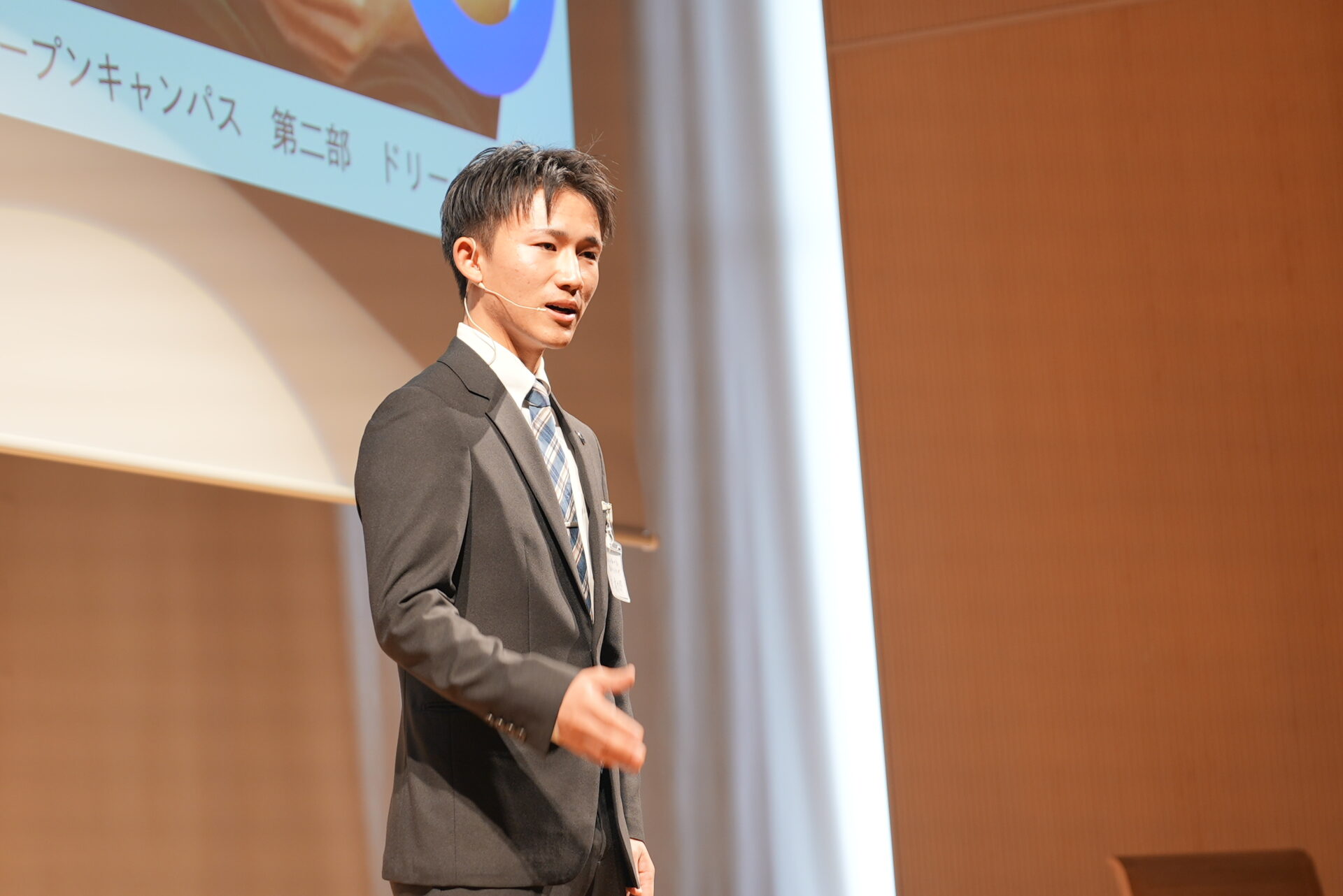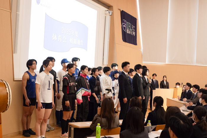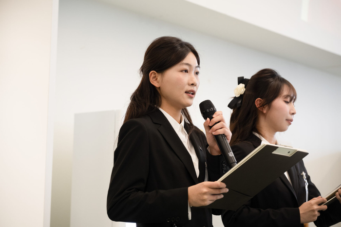 第1部では体育会学生代表による五訓唱和の後、大橋節子学長からの挨拶がありました。企業の方から「“4年後に責任を持つ”覚悟が感じられました」とのお言葉を頂くなど、企業、学生双方の心に確実に響いたようです。