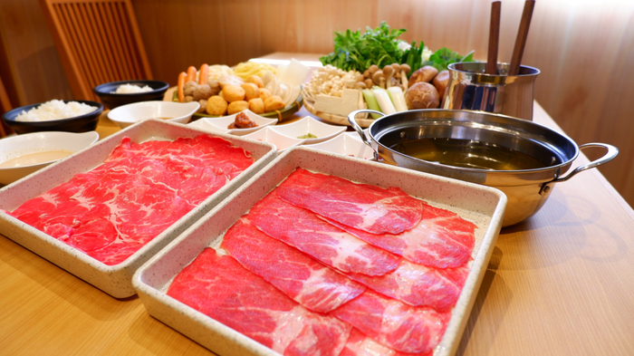 お出汁の種類も豊富で、鰹や昆布をベースにしどのタレにも合う「和風だし」、豆乳をベースにしたほんのり甘みを観じる「豆乳だし」、牛骨をじっくりコトコトと煮込んだ「牛骨白湯だし」、ぴりっと辛味を感じる「火鍋だし」に加え、「すき焼き」の割り下と5種類用意されているので、細分化された個々人の食の好みにも対応できる。