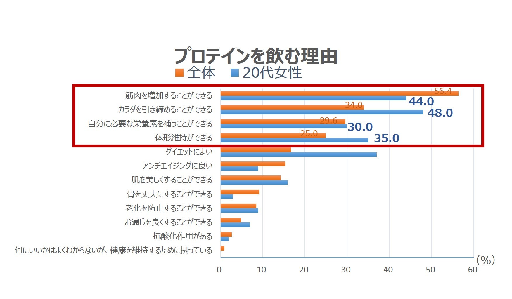 今回の調査結果で、プロテインを飲んだことがある人が35.4%いることがわかりました。「筋肉を増加することができる」「カラダを引き締めることができる」「自分に必要な栄養を補うことができる」という理由でプロテインを飲んでおり、20代女性では、より「体形維持ができる」「ダイエットなどのスコアが高く、ボディメイク目的で取り入れていることがわかりました。健康意識の高い人や、栄養素摂取不足が気になる人などにも広がっているようです。