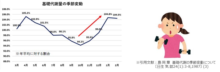 冬は痩せないというイメージを持っている方も多いかもしれませんが、実は1年で1番代謝が上がる時期で、ダイエットに適した季節だともいわれています。人間は恒温動物であるため、体温を36度程度に保ちます。1年中体温をを36度程度に保つために基礎代謝としてエネルギーが使われます。夏は少ないエネルギー消費量で体温をキープできるので基礎代謝は低めですが、気温が低い冬は、体温を上げるためにより多くのエネルギーを消費し、熱を生み出そうとして、基礎代謝量が急増します。この季節にしっかり運動を行うと効率的なのです。