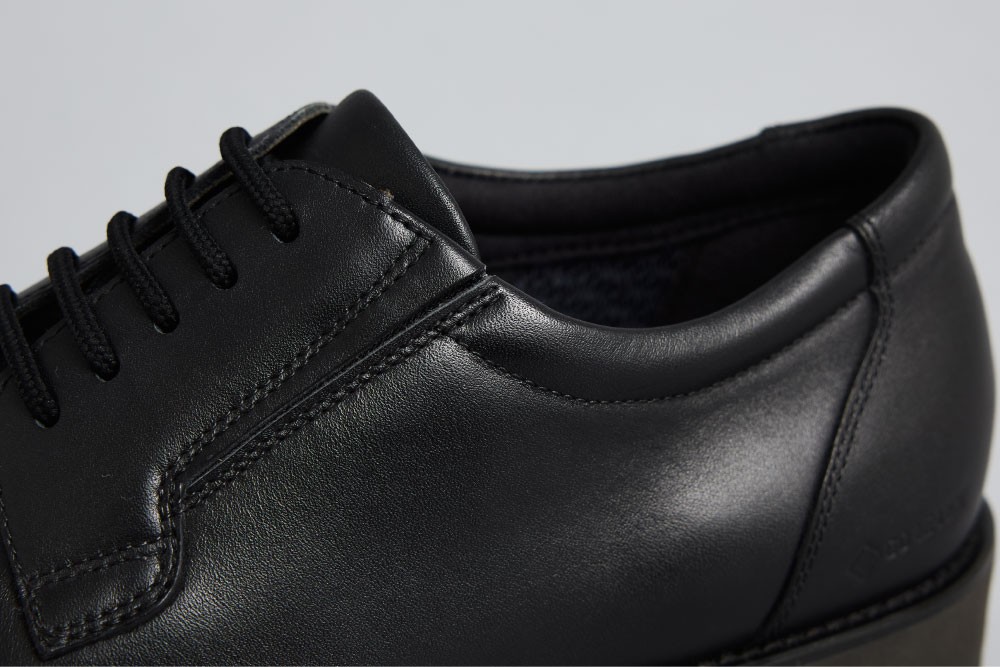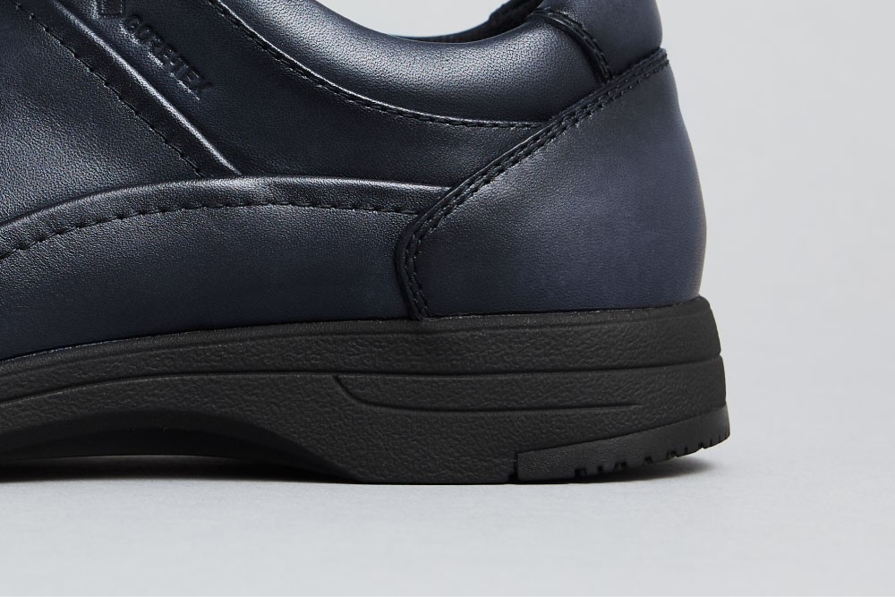 靴紐はストレッチが効いていることに加え、サイドエラスティック(ゴム)を採用しているため紐をほどかずに容易な脱ぎ履きが可能です。 また履き口周りに配したスポンジが足首を優しく包み込み、スニーカーのような快適な履き心地を提供します。