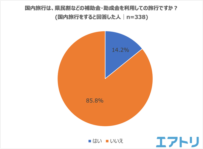国内旅行をするにあたり補助金・助成金を「利用する」人は14.2%で、85.8%が「利用しない」という回答でした。