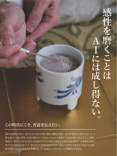 継承の担い手が限られ、香道具を支える職人も減りつつある今、このままでは香道の技法だけでなく、その精神性や感性の体系そのものが失われかねない。機能性・効率・わかりやすさなどといったキーワードが重視される現代のデジタル時代において、言語化しにくい〈曖昧さ〉や、理解に時間がかかる〈余白の美〉といった日本人ならではの美意識を扱う芸道は、可視化されにくいがゆえに周縁化されやすい。
