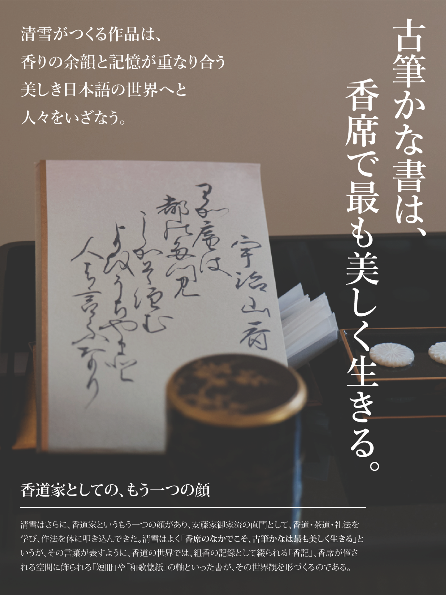 清雪にとって、香道と古筆かなは切り離せない。「香席のなかでこそ、古筆かなはもっとも美しく生きる」という彼女自身の言葉どおり、彼女がつくる屏風や掛軸といった作品は、香席において人々を、美しき日本語の世界へといざなうための入り口となっている。繊細な香りを聞きながら、平安時代の歌人たちの言葉に触れるとき、香席は単なる嗅覚の場を超え、自分の記憶と香りの余韻が重なり合う、とても豊かな時間が流れるのである。