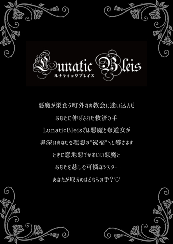 LunaticBleisは、悪魔と修道女が共存する幻想的なカフェです。訪れたあなたは、悪魔の誘惑かシスターの慈愛に導かれ、非日常の癒しとスリルを体験できます。