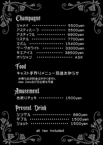 また、オムライスやミックスナッツなどの軽食やおつまみをご用意している場合もございます。料理好きのキャストがいる日には、特別な料理も提供されることがあります。