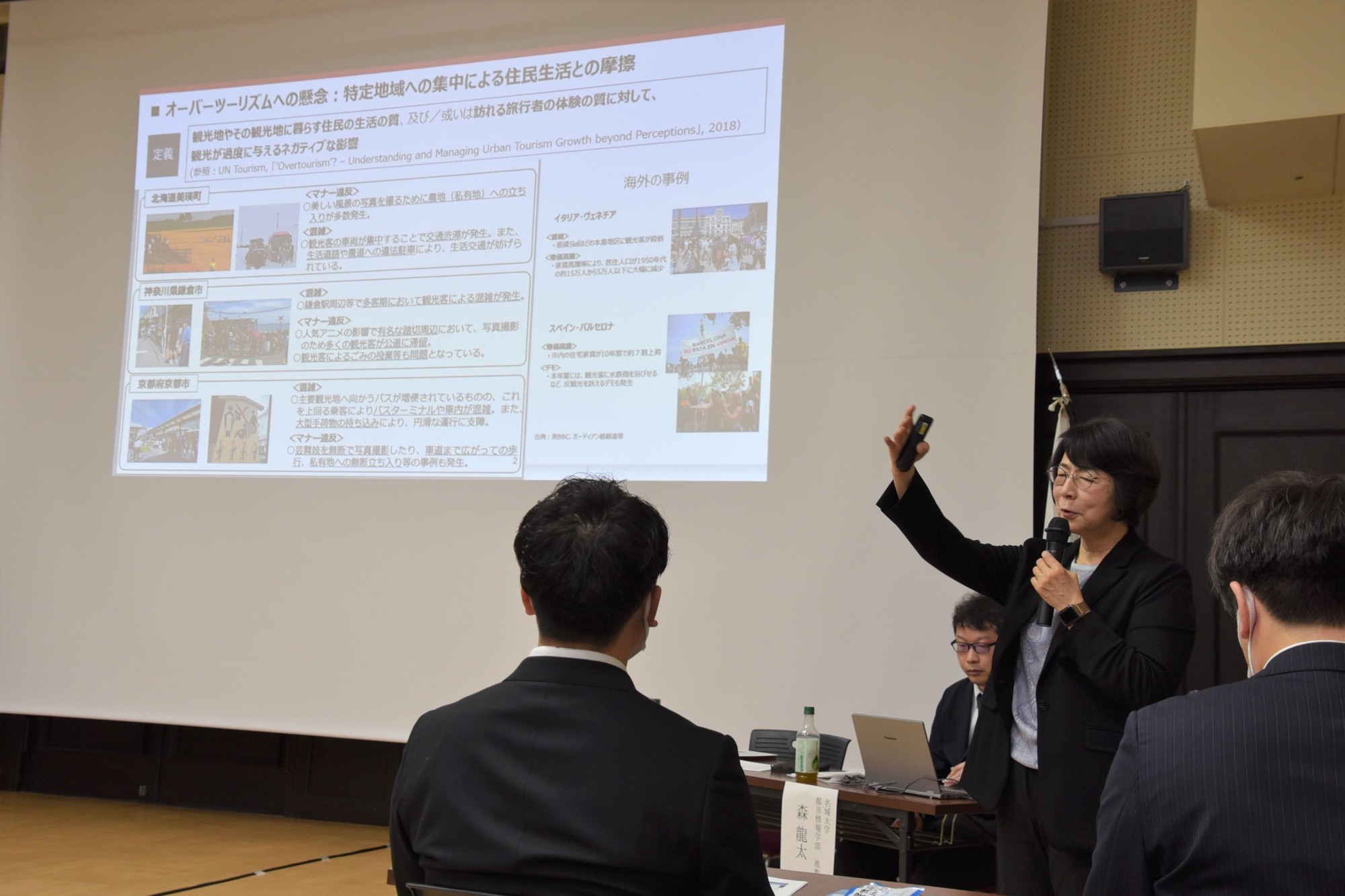 続いて登壇した森准教授は、名古屋市などの自治体と連携した講義やフィールド調査といった観光系科目群のほか、森ゼミによる富山県氷見市でのナンバープレート調査など都市情報学部での観光学の学びの概要を説明し「データに基づいた観光政策を提案・分析できる人材の育成を目指している」と紹介。「学生たちは活動によって気づきを得て、それまで知らなかった地域でも愛着が生まれ、10年後、20年後に大きな観光プロモーションになる可能性を秘めている」と強調しました。