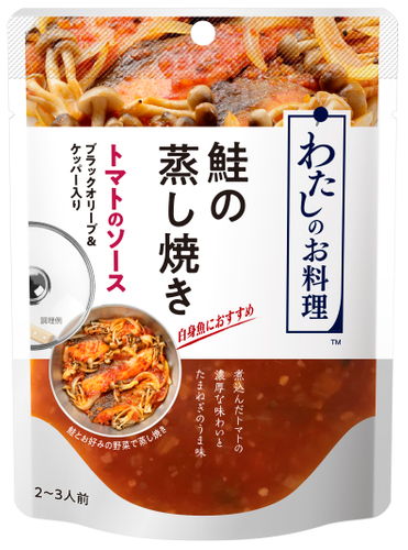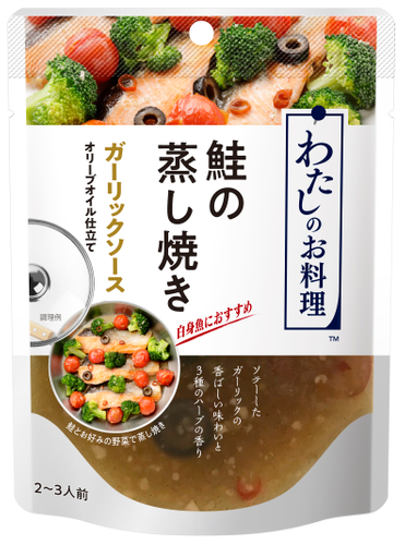 「わたしのお料理」ブランドの新商品「鮭の蒸し焼き」は、鮭の切り身と野菜を合わせフライパンで調理するだけで、ボリューム感のあるメインのおかずができる、蒸し焼き用ソースです。ラインアップは、「ガーリックソース オリーブオイル仕立て」「バジルソース パルミジャーノ・レッジャーノ入り」「トマトのソース ブラックオリーブ&ケッパー入り」の洋風ソース3品です。鮭と相性の良い原材料を使い、素材の味が重なり合った奥深い味わいです。