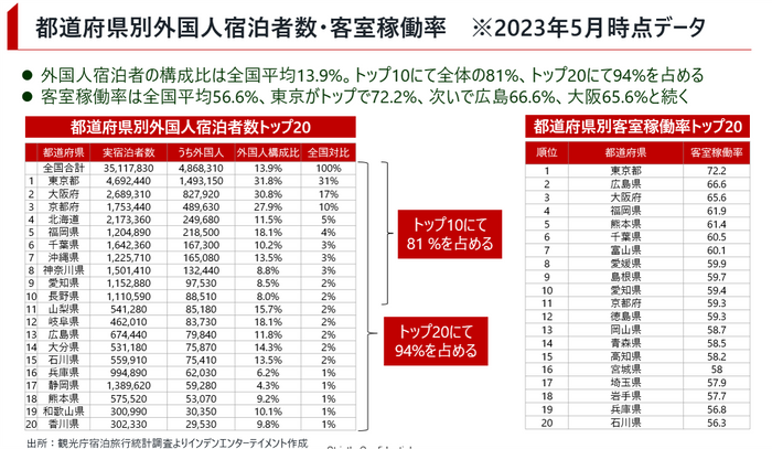 宿泊者数のうち外国人宿泊者は13.9%、都道府県別訪日エリアはトップ10にて全体の81%を占める