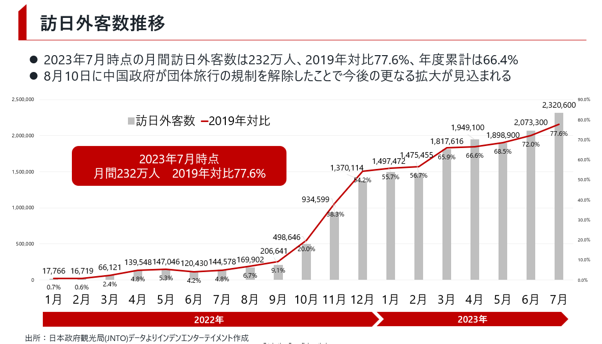 2023年7月時点の訪日外客数は2019年対比77.6%まで回復