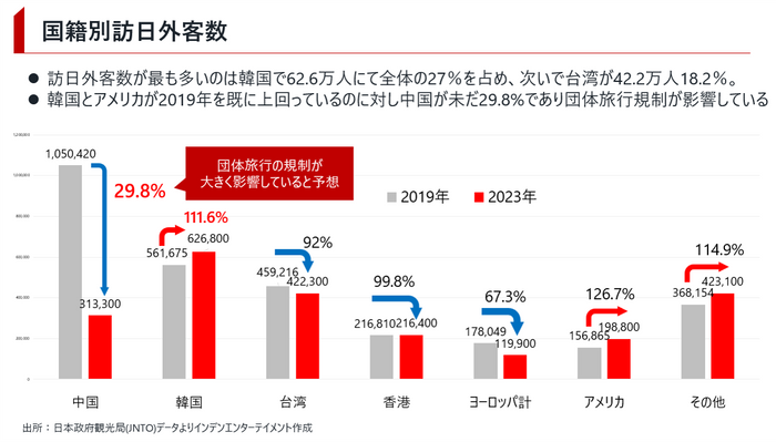 国籍別訪日外客数は韓国とアメリカが2019年を既に上回り、中国が依然29.8%のため今後の団体客に期待が集まる