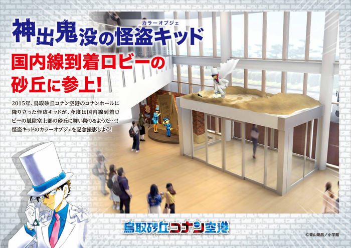 鳥取砂丘コナン空港のメインビジュアル(制服姿のコナン君と蘭ちゃん)、メインビジュアルをオブジェ化した「シンボルオブジェ」、今春新たに登場した人気キャラクター「赤井秀一カラーオブジェ」を紹介しています。メインビジュアルは愛称化の折に青山先生が描き下ろしてくださいました。
