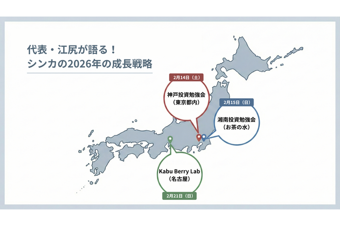 コミュニケーションプラットフォーム「カイクラ」の開発・販売を行う株式会社シンカ(本社:東京都千代田区、代表取締役社長CEO:江尻 高宏、以下「シンカ」)は、2026年2月に開催されます個人投資家向け会社説明会「神戸投資勉強会」「湘南投資勉強会」「Kabu Berry Lab」それぞれに登壇いたします。