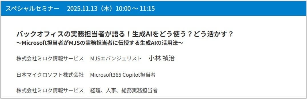 本セミナーでは、MJSの経理、人事、総務の実務担当者が生成AIを日常業務にどのように使っているかをご紹介し、更なる活用法について探求します。