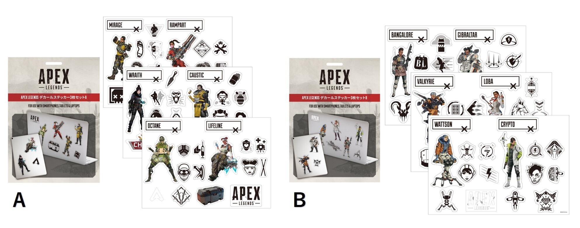 フルカラー印刷のデカールステッカーは、1セットにつき3枚入りで6人のキャラクターが含まれ、さらにApexロゴをはじめとするゲームの中で登場する様々なオブジェクトが勢ぞろい。