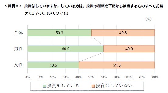 ちなみに、投資をしている人の割合は、男性6割(60.0%)に対し女性4割(40.5%)と、男女差が見られました。