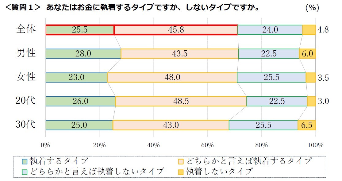まず、お金に対するこだわりについて聞いたところ、「どちらかと言えば執着するタイプ」(45.8%)と「執着するタイプ」(25.5%)を合わせ、7割強(71.3%)がお金に「執着する」と回答しました。
