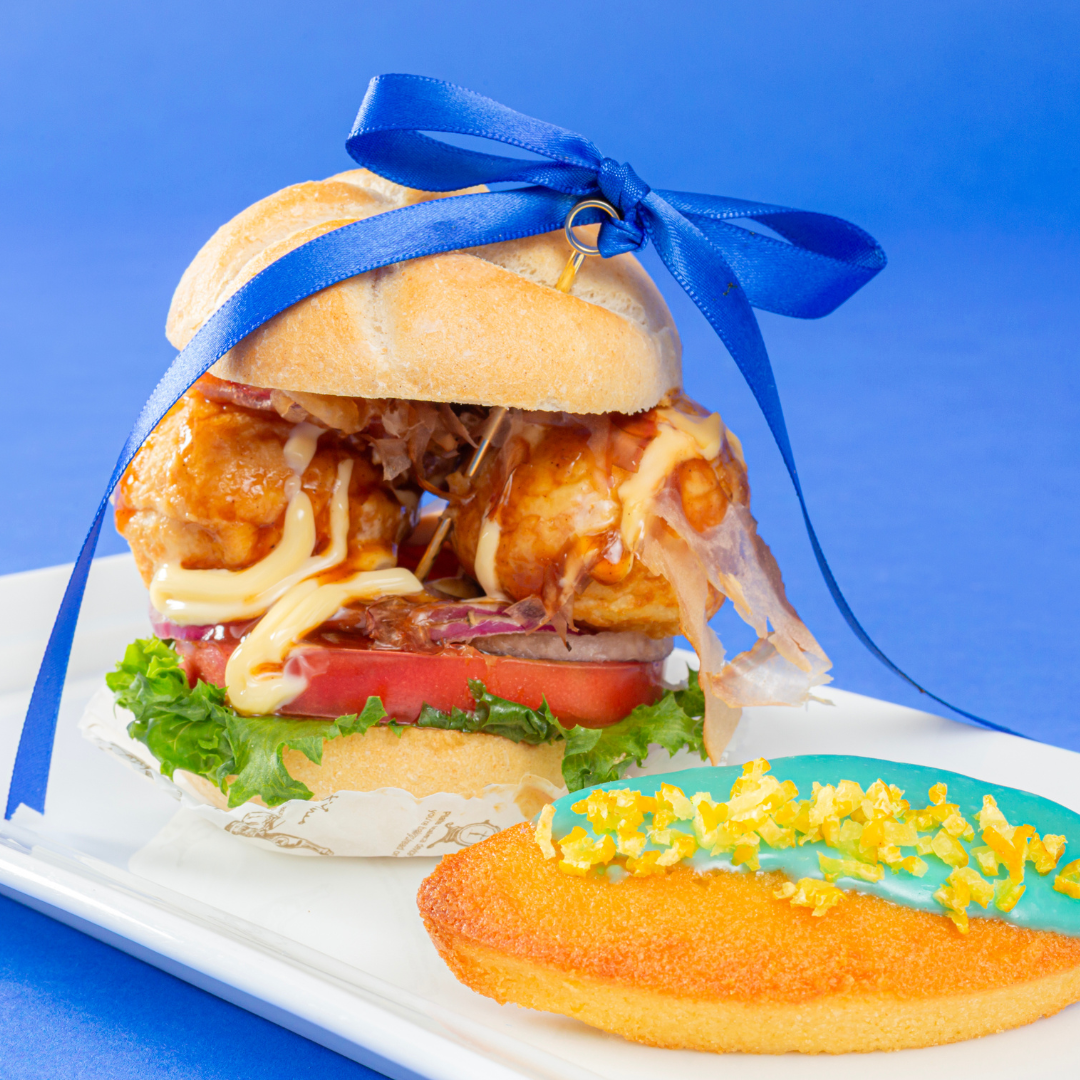 たこ焼き、紅生姜の天麩羅など、ご出身地である大阪の名物をはさんだハンバーガー。