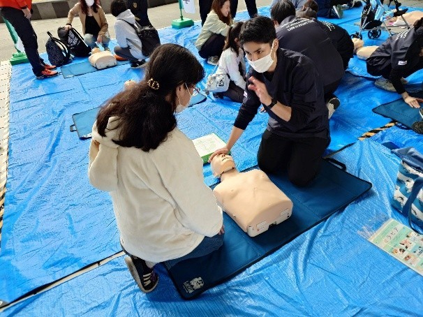 午後には場所をJR京橋駅北口前広場に移し、本学ライフサポート部の学生とJR京橋統括駅の職員や午前の部の参加者が連携して、一般の方を対象とした心肺蘇生法やAEDの使用方法などの一次救命処置(BLS)体験会「救急フェア IN 京橋駅前」を開催しました。京橋駅付近を通行されるご家族連れをはじめ、幅広い年齢層の方にご参加いただくことができました。体験者数は2時間で100名を超え、会場は終始活気に満ち賑わいをみせました。多くの方に一次救命処置の重要性を体感いただき、実践方法を学んでいただく機会となりました。