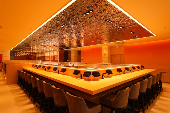 「廻転鮨 銀座おのでら本店」内装/波、イカ釣り舟の明かりを彷彿とさせる天井、夕陽をイメージした橙色の壁