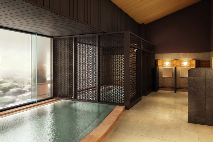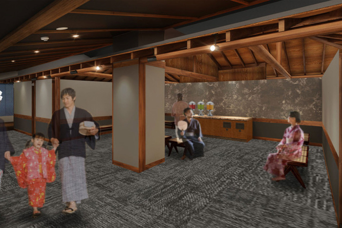片方の内湯の一部は半露天風呂にリノベーションし、もう片方の露天風呂は格子を一新するなど、今までよりも開放感のある空間で温泉をお楽しみいただけます。また、洗い場に仕切りを設けるなど、使い勝手の良さにも配慮いたしました。伊香保の名湯を楽しんだ後は、大屋根をモチーフにしたデザインの和情緒あふれる湯上りラウンジでゆっくりと喉をうるおしてください。