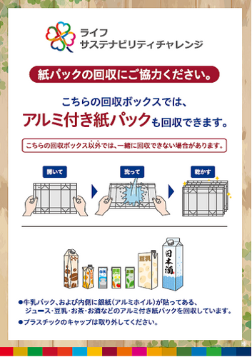“おいしい” “ワクワク” “ハッピー”をお届けするライフコーポレーションは、日本テトラパック株式会社のご協力のもと、リサイクル回収BOXを設置している近畿圏店舗でも「アルミ付き紙パック」を回収できるようになりました。