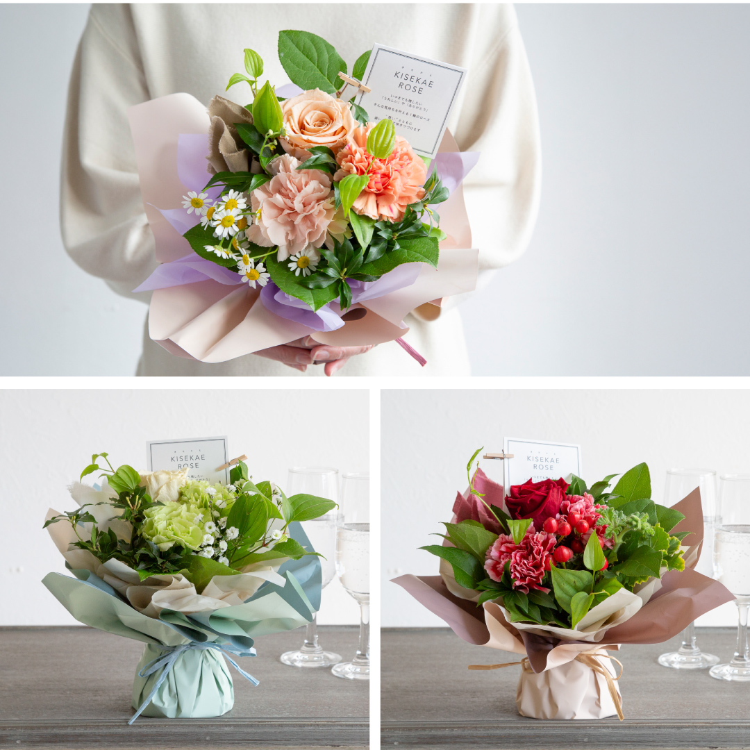 生花の花束の中に1輪、大輪のプリザーブドローズを忍ばせました。生花が枯れた後、ローズだけを取り出し、ほんのり香るサシェに「きせかえ」ます。
