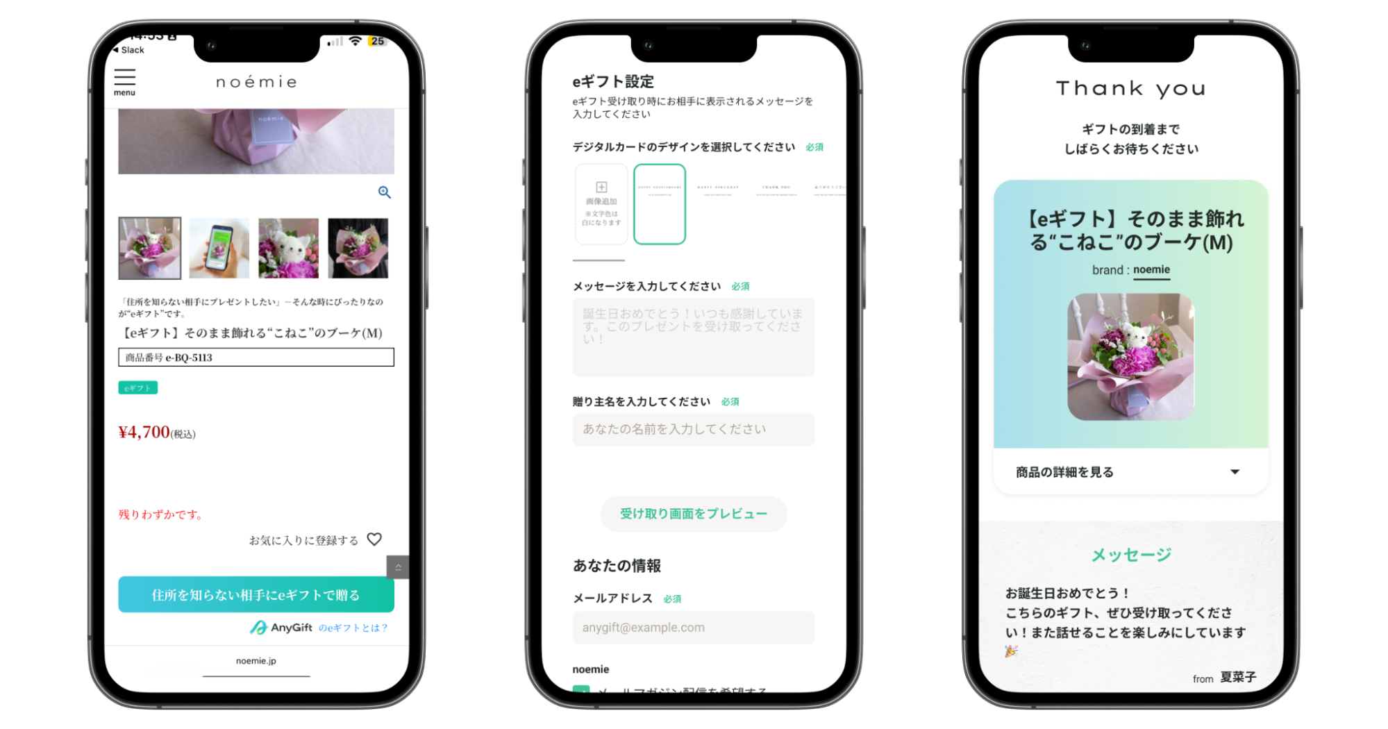 そこでこの度、お客様にもっと気軽にnoemieの商品をプレゼントとしてご利用いただきたいという思いから、AnyGiftの導入を決定いたしました。