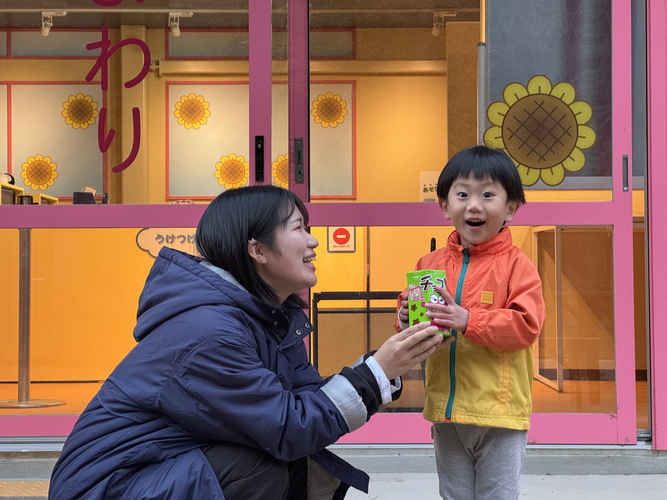 アスレチックエリア、のんびりのはらエリアにそれぞれ設置された2つの「チョコビスタンプ」を使って、しんちゃんがデザインされたオリジナル台紙に、たくさんのチョコビを集めるスタンプアート体験をお楽しみいただけます。完成した作品をスタッフにお見せいただいた方には本物の「チョコビ」をプレゼントいたします