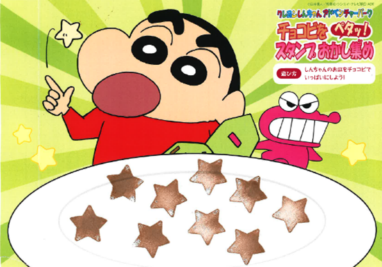 スタンプペタペタ!しんちゃんのお皿に集めたチョコビがオラのもの?! クレヨンしんちゃんアドベンチャーパーク スタンプアート「チョコビをペタッ!スタンプお菓子集め」